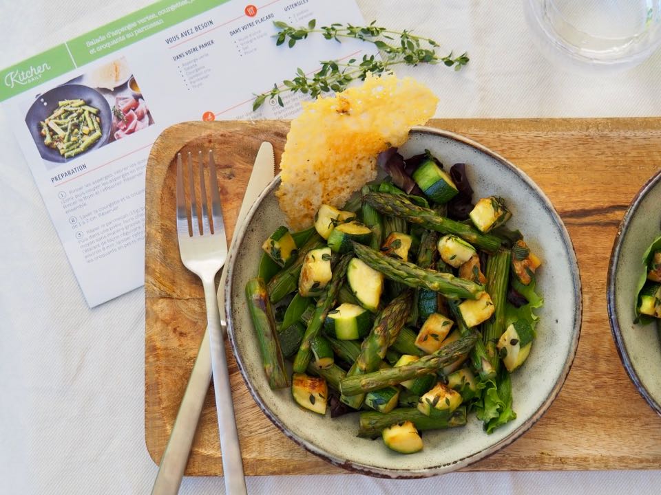 • Salade d’asperges vertes, courgettes, jambon cru et croquants au parmesan ♥