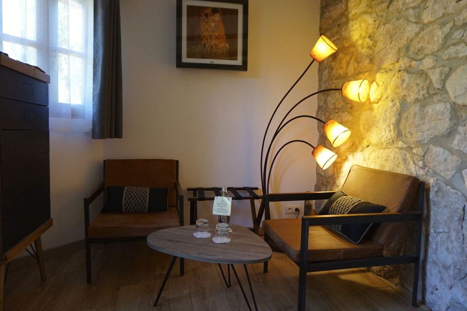 Notre chambre, l’ancienne cabane du jardinier, donne sur le potager. Murs de pierre, poutres apparentes et décoration soignée… elle a vraiment beaucoup de charme ! Côté confort, tout y est ! Elle est spacieuse et bien équipée. Mention spéciale pour notre belle salle de bain avec baignoire à bulles et luminothérapie !