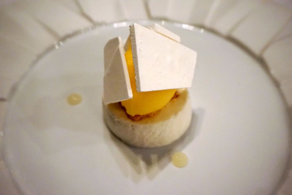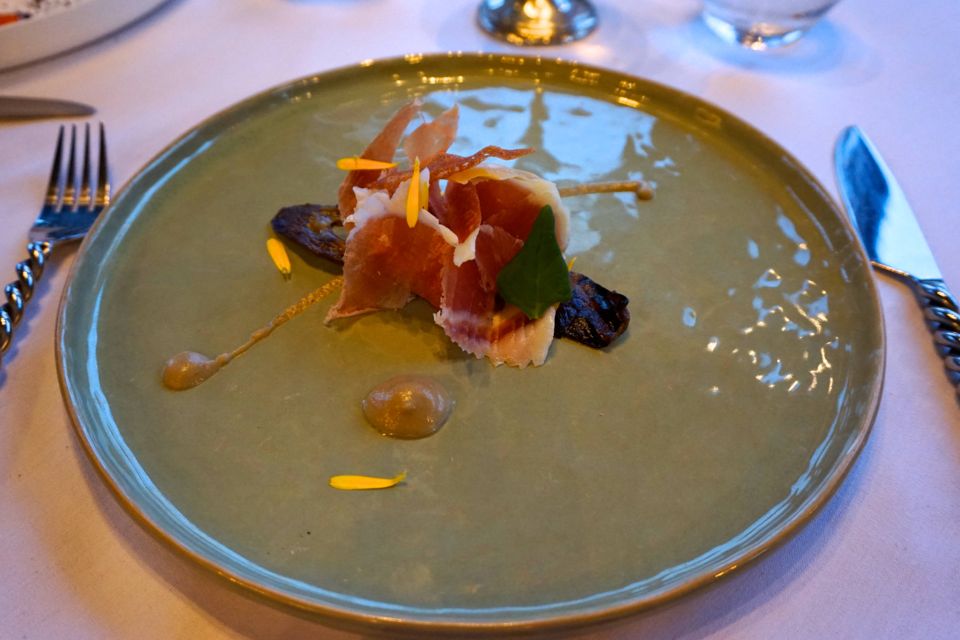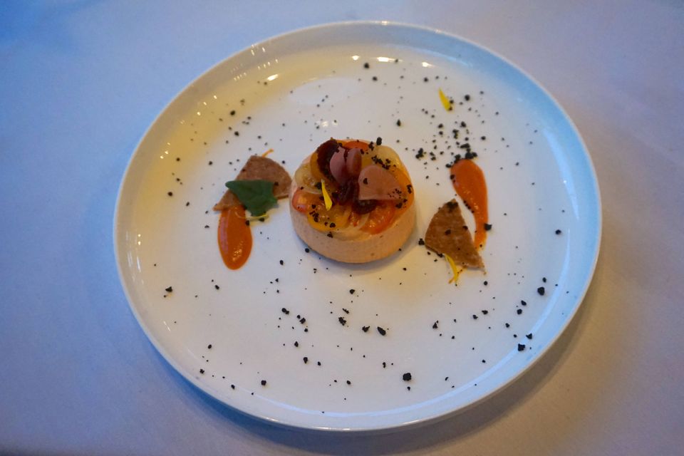 L’expérience culinaire a donc commencé par un apéritif et ses amuses bouches… J’ai découvert le champagne au safran, original ! Suivis d’une « aubergine confite – grillée, Prisuttu de Zicavo 18 mois et tuile à la châtaigne » pour moi et d’un « bavarois de tomates, pickles de légumes, feuilletage minute » pour Mr ChouetteWorld.