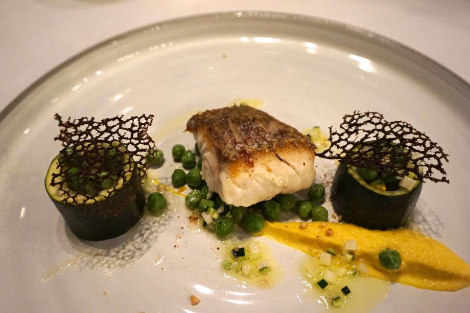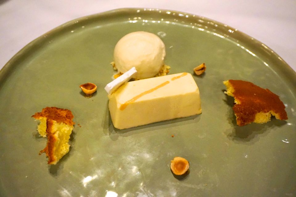 Comme plat principal, j’ai craqué pour le « veau bio corse comme un rôti, coppa, crème de shitaké et gnocchi à la châtaigne »… Mr lui a dégusté un « pagre snacké, petits pois frais, courgettes jaune et verte, tuile à l’encre de seiche et huile vierge »… On a été vraiment bluffé par les plats ! Des cuissons maitrisées, des ingrédients de qualité et un assaisonnement juste… trio gagnant !