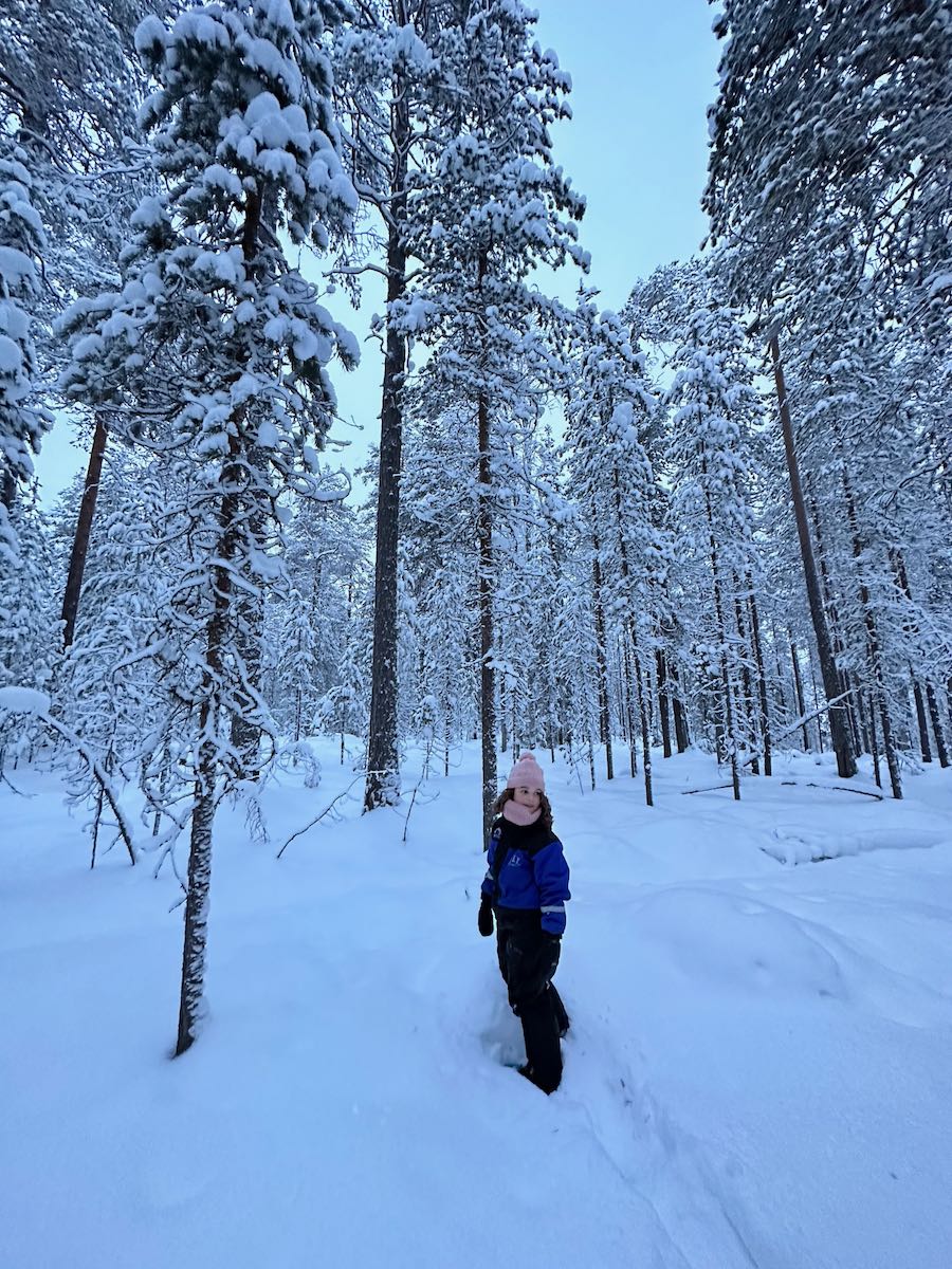 Nous avons opté pour cette balade en raquettes de 3h avec un guide et on ne regrette pas ce choix ! Il nous a emmenés dans un endroit magnifique et a partagé avec nous plein d’infos sur la faune, la flore qui nous entouraient et sur la Laponie en général. C’était très instructif ! On a beaucoup apprécié le fait que le guide nous emmène hors des sentiers tracés et s’adapte au rythme des enfants. Nous avons pu faire notre trace en raquette dans la poudreuse et nous « perdre » dans la forêt. Nous étions en petit groupe (5 avec le guide). Les sensations étaient géniales ! Comptez 90€ → Plus d’infos ici !