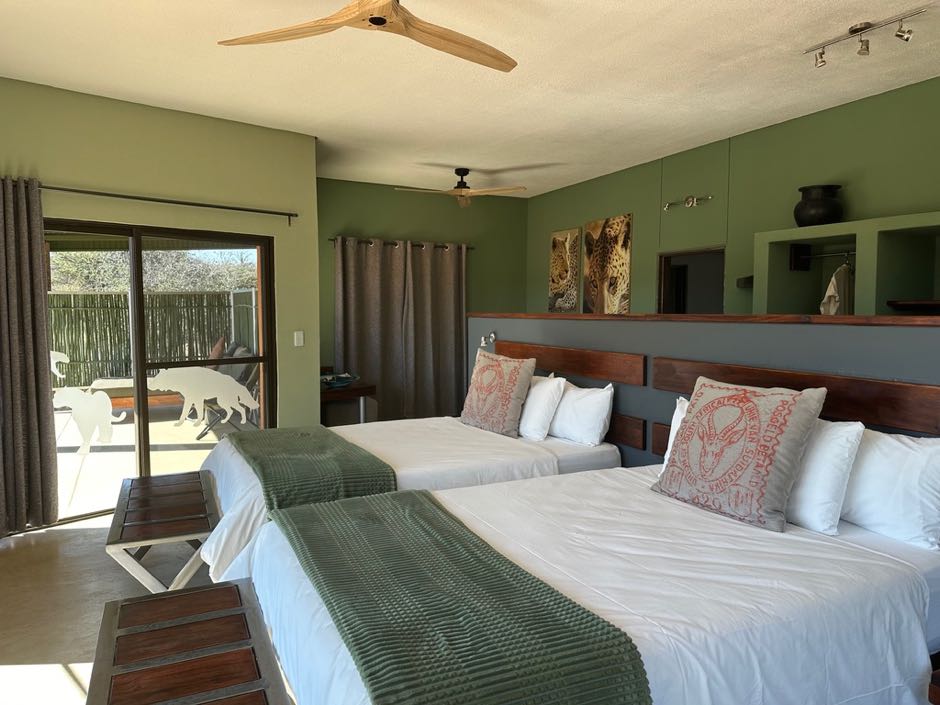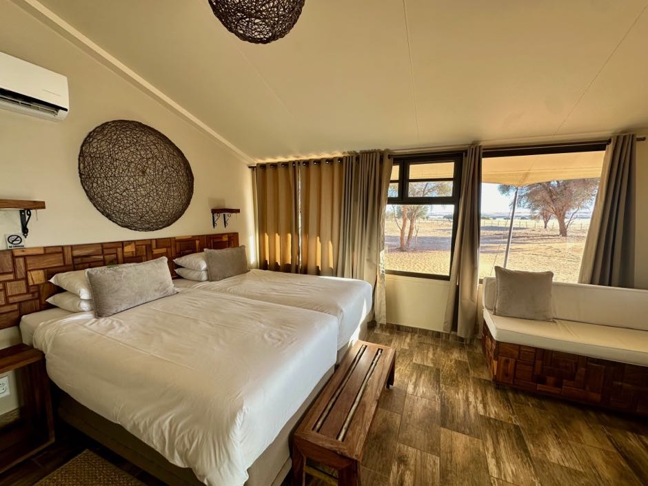Nous avons choisi l’Okonjima Plains Camp. Les espaces communs (réception, salon, salle de restaurant) sont superbes et l’accueil très soigné. Notre chambre avait une très grande baie vitrée qui donnait directement sur la savane d’où on pouvait observer les animaux ! Elle était très spacieuse et confortable. Il y avait aussi une terrasse avec un lit d’extérieur. On aurait voulu passer des heures ici à observer girafes, oryx, antilopes, dik-dik, phacochères, zèbres, koudous… (oui oui, on a vu tout ça uniquement depuis la chambre).
