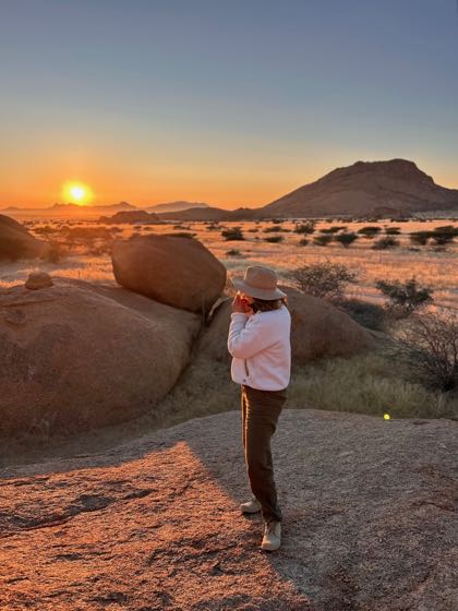 Ce matin, on se réveille encore très tôt, pour assister au lever du soleil depuis la terrasse de notre chalet. Ce fut le plus beau lever de soleil de notre voyage en Namibie ! La couleur ocre des roches était vraiment sublimée, on aurait pu penser que les rochers prenaient feu.