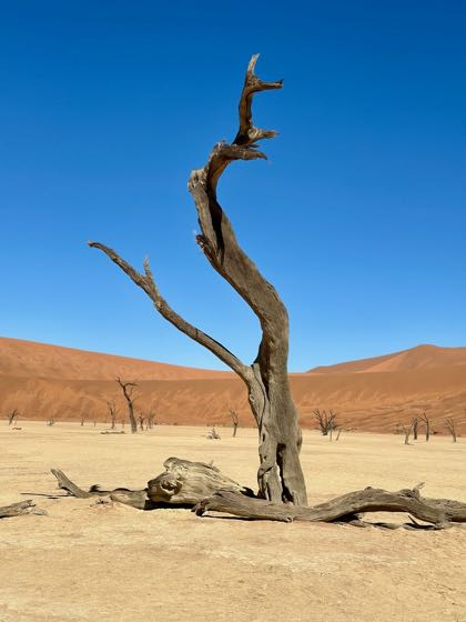 Ce site est l’une des cartes postales les plus emblématiques de Namibie. Il s’agit d’une ancienne cuvette d’argile asséchée, où se dressent encore les squelettes noirs d’arbres morts, figés depuis près de 900 ans. Le contraste entre le sol blanc, les troncs sombres et les dunes rouges qui les encerclent est spectaculaire, surtout sous un ciel bleu intense. Une atmosphère presque irréelle, comme un décor de cinéma.