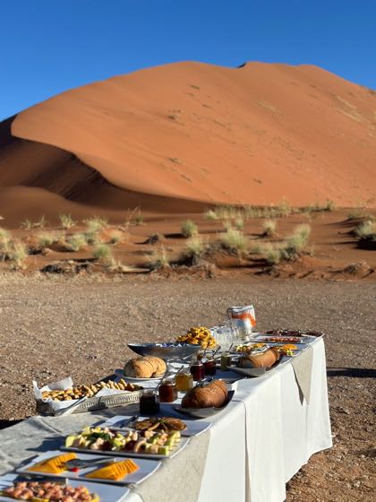Voir le lever du soleil au-dessus du désert en contemplant l’immensité du Namib et ses dunes rouges à perte de vue, c’était magique. Après l’atterrissage, nous avons eu le droit à un délicieux petit-déjeuner installé au pied des dunes, face au désert… On a vraiment vécu une expérience hors du temps dont on se souviendra longtemps !