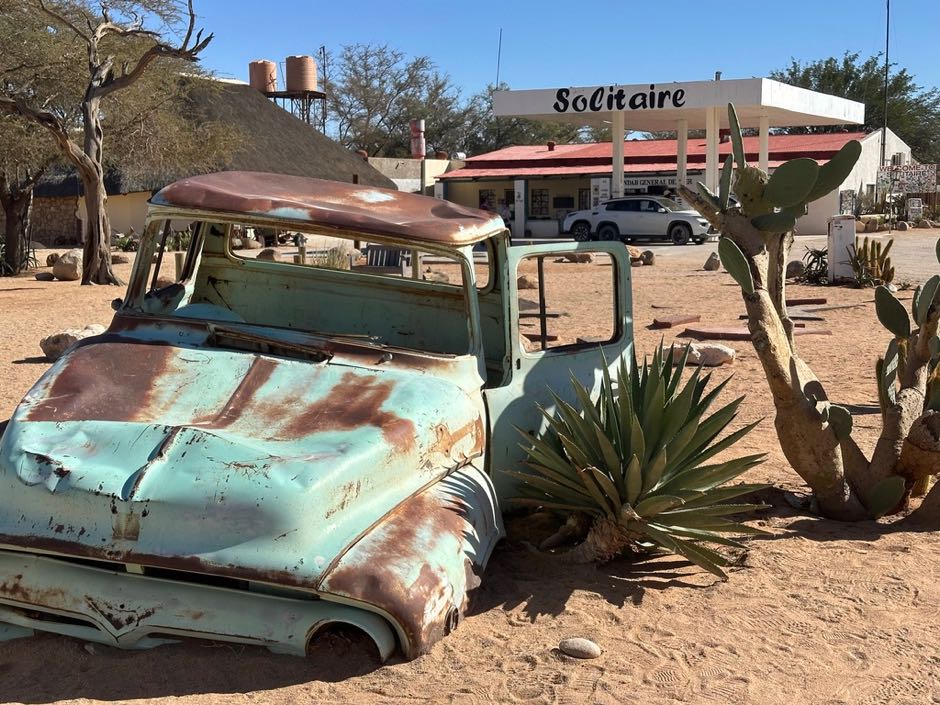 Un peu avant d’arriver à destination, on s’arrête à Solitaire, une station essence emblématique du désert du Namib. Il y a ici un petit air des stations de la route 66 aux USA ! La dégustation de la tarte aux pommes est apparemment une étape obligatoire ici, alors on s’exécute… un délice !