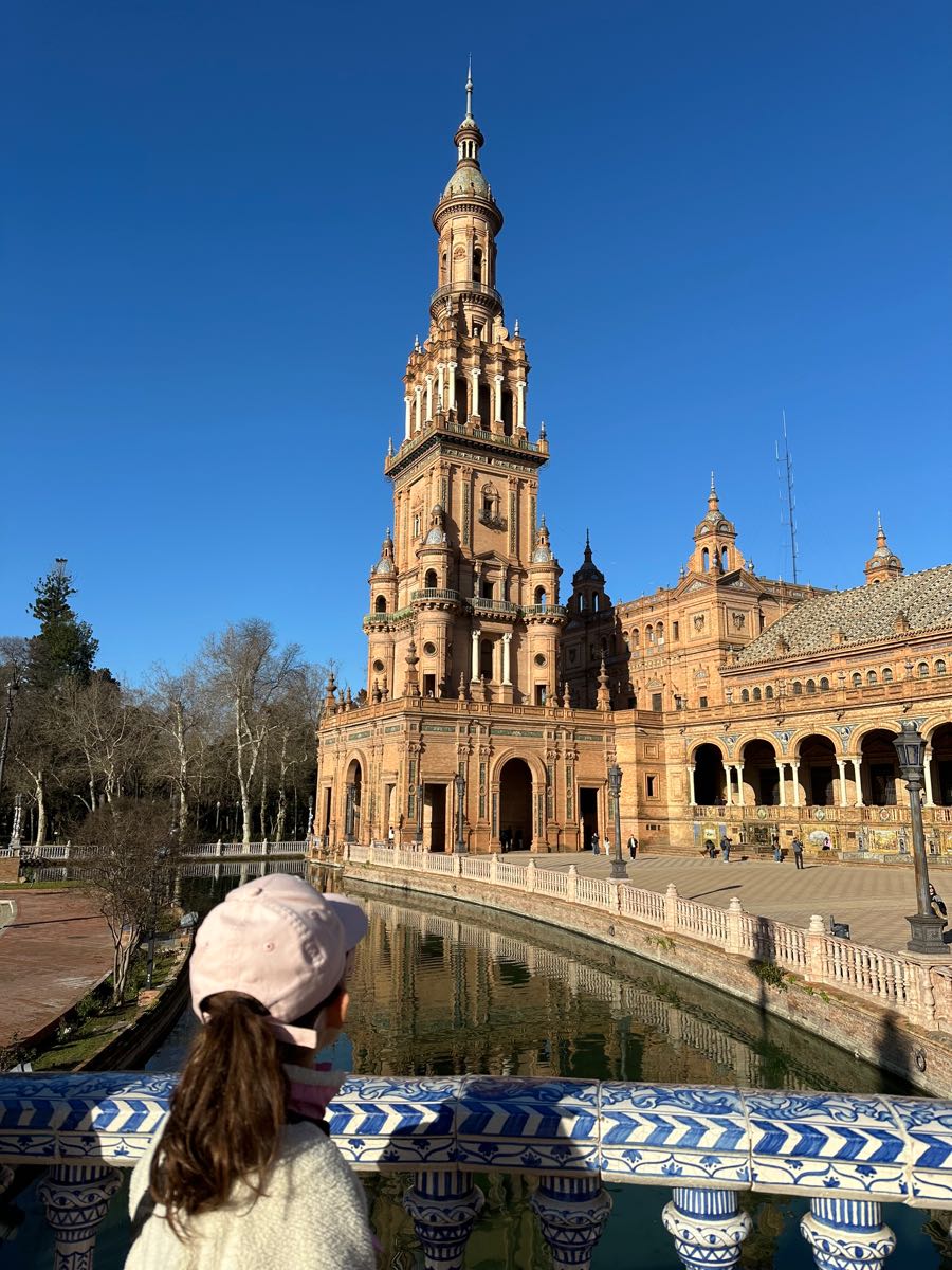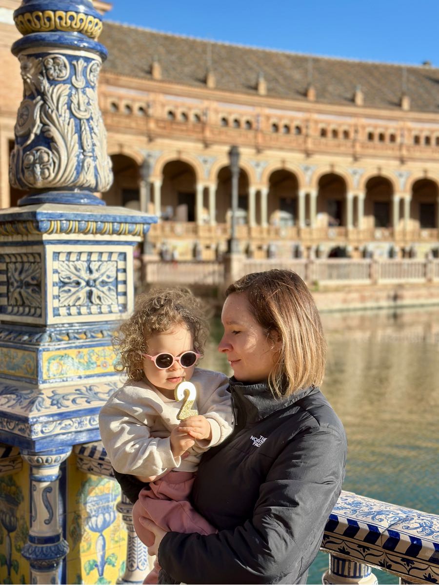 Son architecture est assez grandiose ! Elle est immense (50 000m2, rien que ça) et elle est bordée par un grand palais aux façades ornées de colonnes et de fresques d’azulejos (idéales pour jouer à cherche et trouve). C’est vraiment un endroit à voir à Séville ! Pour la petite anecdote, c’est ici que l’on a soufflé les bougies pour les deux ans de la petite dernière 🙂