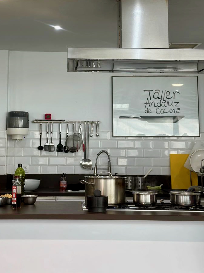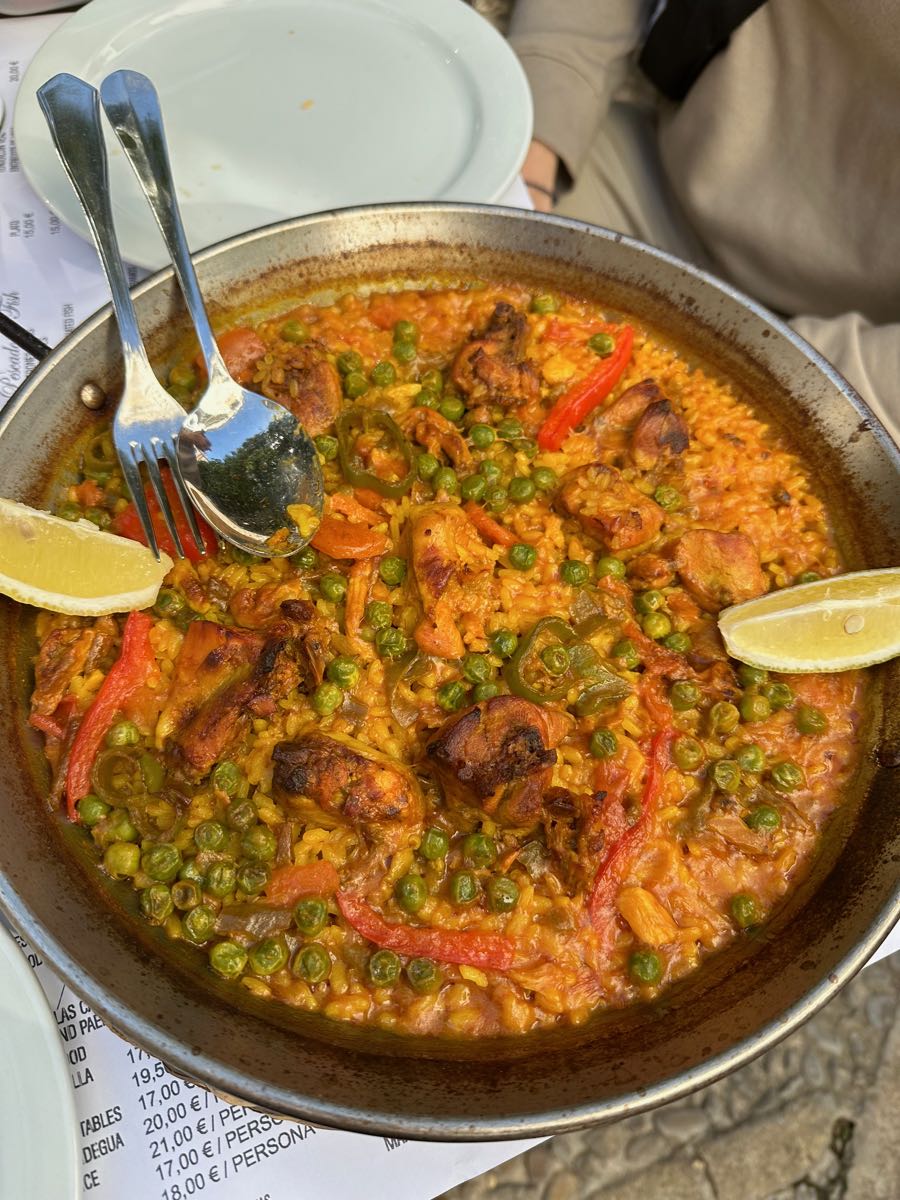 On a commencé par une visite très instructive du marché, avec une explication sur les différents produits locaux. Ensuite, on est passé en cuisine et on a appris 3 recettes espagnoles que l’on a dégustées ensuite : le salmorejo, les garbanzos com espinacas et la paella aux légumes de saison et poulet (ou végétarienne).