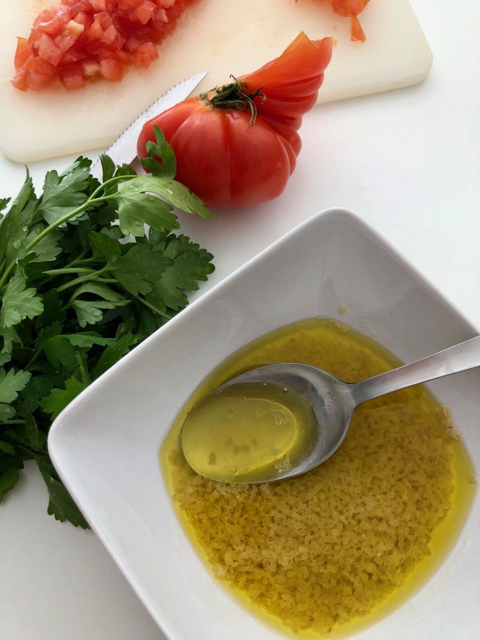 - Rincez le boulghour et laissez-le gonfler dans l’huile d’olive et le jus de citron (environ 15/20 min)