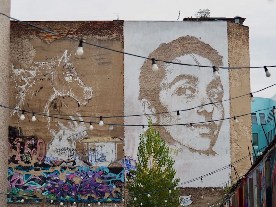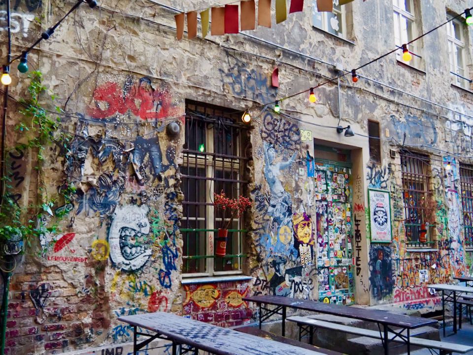 A quelques mètres de là, un peu plus loin dans la Rosenthaler Straße, se trouve une autre cour intérieure à l’ambiance bien différente ! C’est d’ailleurs un contraste qui résume bien Berlin avec ses univers très différents qui se côtoient naturellement. Ici, les murs sont recouverts de street art, on y trouve un cinéma, des ateliers d’artistes, un musée, un café, un bar… Un lieu alternatif qui résiste en plein coeur de Mitte !