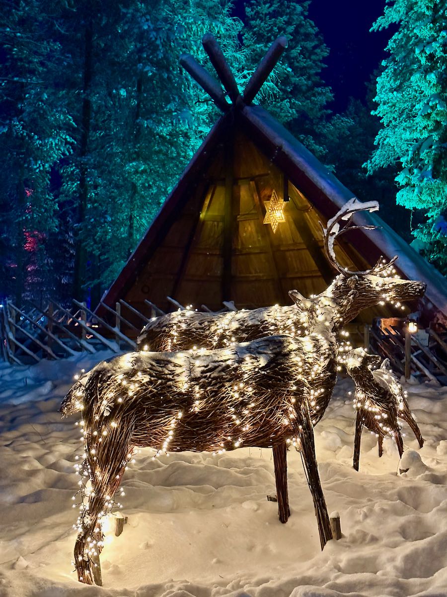 J’avais lu des avis plutôt négatifs sur le village du Père Noël de Rovaniemi, décrit comme bondé, avec peu de charme et trop de boutiques souvenirs. De notre côté, nous avons été agréablement surpris. Nous avons beaucoup aimé visiter le village du Père Noël ! Il n’y avait pas tant de monde que cela en semaine en plein mois de décembre (on y est retournés le weekend, là effectivement, il y avait plus de monde) et on a trouvé l’endroit plutôt charmant, en tout cas en hiver. Entre la neige, les illuminations, les chalets, les décorations, les lutins, les rennes… la magie de Noël était bien là ! C’était encore plus féérique de nuit !